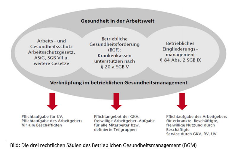 Die drei grundlegenden Säulen für gesunde Arbeitsbedingungen sind die Vorgaben im Arbeits- und Gesundheitsschutz, die betriebliche Gesundheitsförderung und das betriebliche Wiedereingliederungsmanagement (BEM). Das Betriebliche Gesundheitsmanagement vereint und koordiniert diese 3 Gebiete, ergänzt mit Maßnahmen der Betriebsärtlichen Betreuung zu einem zielgerichtetetn Prozess, der auf die Gesundheit aller Mitarbeitenden abzielt. Das zeigt auch der Leitfaden Prävention, der versucht, die Gesundheit der Mitarbeiter optimal zu fördern (GKV Spitzenverbandes 2014, S.79):